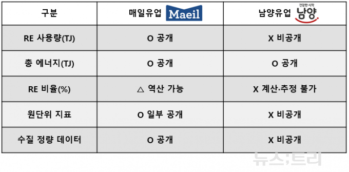 같은 식품업계 기업과 비교하면 남양유업의 정보 공개 수준은 더욱 대비된다. 앞서 본지가 분석한 매일유업의 경우 재생에너지 비율을 직접 공개하지는 않았지만, 재생에너지 사용량과 총 에너지 사용량을 함께 공개해 전환 수준을 역산할 수 있었다. 온실가스·에너지·용수 등 주요 지표에서도 총량과 함께 원단위 또는 항목별 수치가 제시돼 최소한의 검증은 가능한 구조였다. 반면 남양유업은 재생에너지 사용량과 구성, 전환 방식 자체를 공개하지 않아 전사 기준 재생에너지 전환률을 계산하거나 추정하기 어렵다. 두 기업의 차이는 공개 여부 자체보다도, 외부에서 ESG 이행 수준을 검증할 수 있는지 여부에서 뚜렷하게 갈린다.