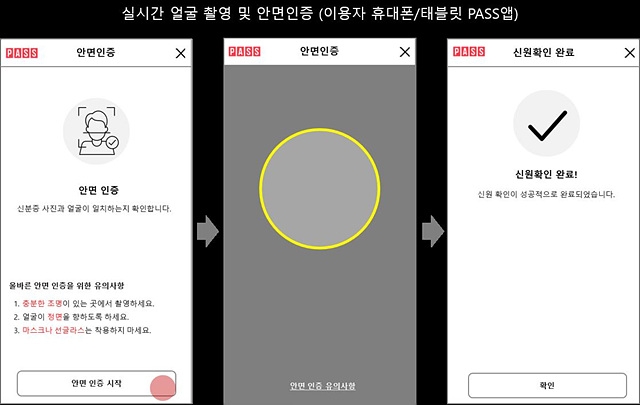 안면인증 시스템은 이통3사가 운영하는 패스(PASS) 앱을 활용해 제공되는데, 이용자의 접근성 및 활용도를 고려해 패스 앱에 가입하지 않아도 이용이 가능하다. 신분증의 얼굴사진과 신분증 소지자가 동일한 사람인지 여부가 확인되면 결과값(Y, N)만 저장·관리하고 인증에 사용된 생체정보 등은 별도 보관하거나 저장하지 않는다.