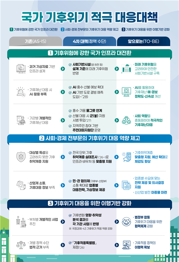 내년부터 시행되는 4차 대책은 대형화·장기화되는 기후재난에 대비한 국가기반시설(인프라) 혁신, AI를 접목한 신속한 재난 예·경보, 취약계층·산업계 대상별 맞춤형 지원 등이 골자로 담겨있다.