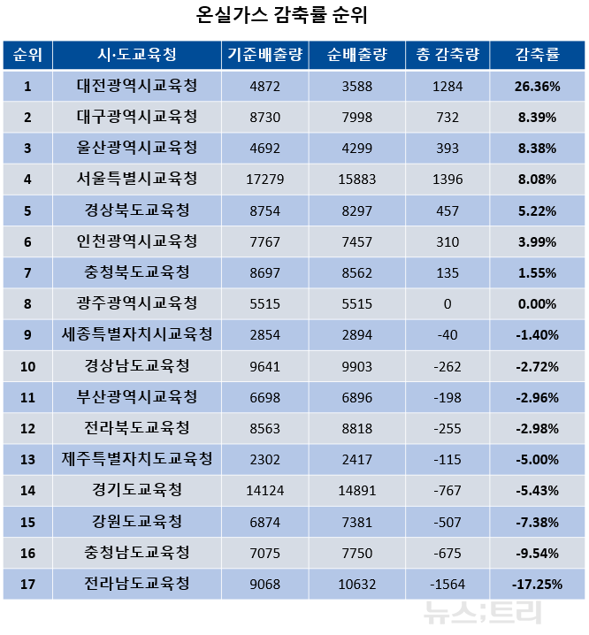 유일하게 목표를 달성한 대전교육청은 기준배출량 4872톤 가운데 1284톤을 줄이며 감축률 26.36%를 기록했다. 정부 권장목표를 2배 가까이 상회한 수준이다. 2위부터는 감축률이 급격히 낮아졌다. 대구교육청(8.39%), 울산교육청(8.38%), 서울교육청(8.08%)은 상위권을 차지했지만 감축률은 한자릿수에 머물렀다.