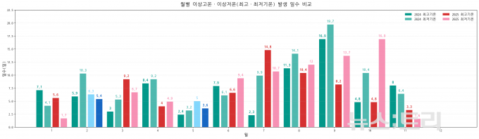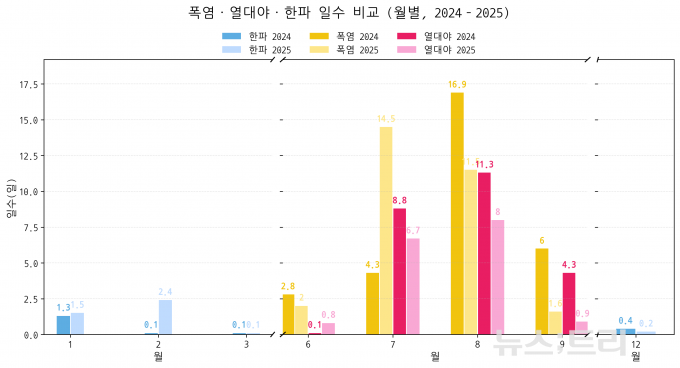 여름은 더 뜨거워지고 겨울은 더 차가워졌다. 올초 한파 일수는 2024년 1.9일에서 2025년 4.2일로 전년 대비 2배 이상 늘어났고, 봄철에는 이상저온도 잦았다. 대부분의 달에서 이상고온(특히 최저기온 기준) 발생이 두드러졌지만, 올해 2월과 5월에는 이상저온 일수가 상대적으로 늘었다.