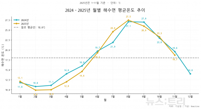 해수면 온도 역시 빠르게 상승했다. 7월 우리나라 주변 해역 해수면 온도는 24.6℃로 최근 10년 중 가장 높았다. 2025년 여름철 상승폭이 2024년보다 더 가팔랐고, 8~9월에는 두 해 모두 27℃ 안팎의 고수온이 이어졌다. 여름 이후에도 10월까지 23℃ 이상이 유지되며 해수면 고온현상이 장기화됐다. 해수면 고온 현상은 연안 생태계에 악영향을 미칠 것으로 우려된다.