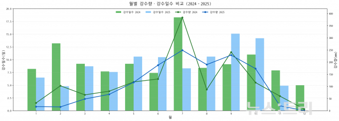 이렇게 비가 많이 내렸지만 가뭄은 더해졌다. 올 1월 비가 평년보다 적게 내려 전국 곳곳에서 가뭄이 관측됐고, 봄에는 경기·강원·충청·경북, 여름에는 강원 영동과 남부·제주 일부 지역, 8~9월에는 강원 전역에서 심한 가뭄이 나타났다. 짧은 폭우와 긴 건조가 반복되며 '강수량은 많은데 물은 부족한' 기후역설이 현실이 된 셈이다.