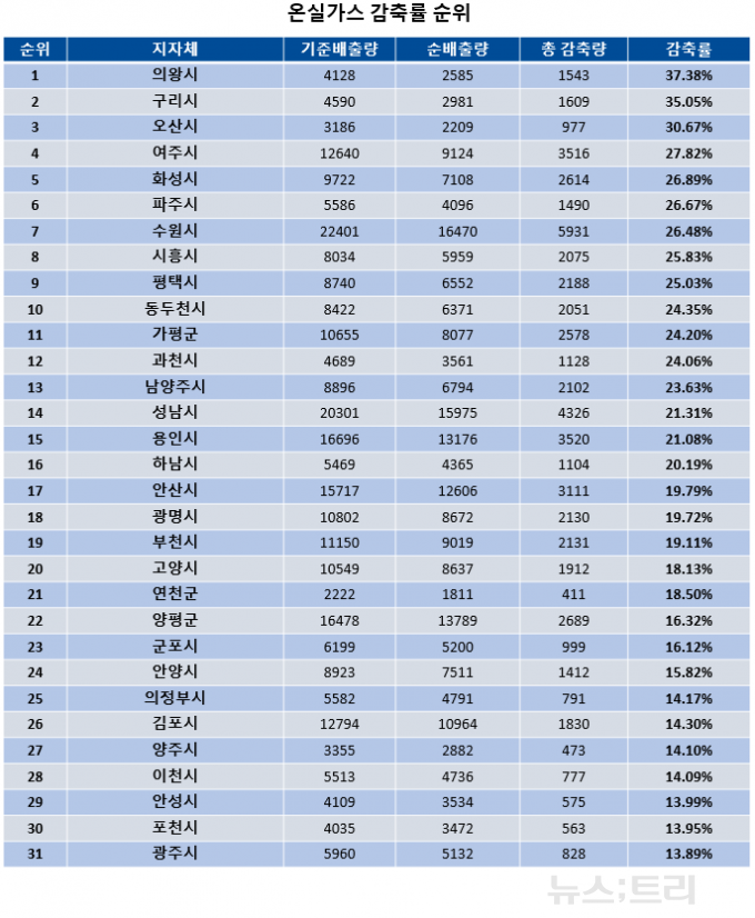 의왕시는 기준배출량 4128톤 가운데 1543톤을 줄이며 감축률 1위를 기록했다. 구리시와 오산시도 30% 이상의 감축률로 상위권을 형성했다. 수원시는 감축률뿐 아니라 절대 감축량에서도 5931톤을 줄이며 규모있는 감축 성과를 냈다.