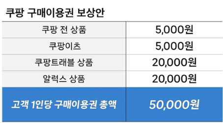 쿠팡은 이들 고객들에게 로켓배송·로켓직구·판매자 로켓·마켓플레이스 쿠팡 전 상품(5000원), 쿠팡이츠(5000원), 쿠팡트래블 상품(2만원), 알럭스 상품(2만원) 등 고객당 총 5만원 상당의 1회 사용이 가능한 4가지 구매 이용권을 지급한다.