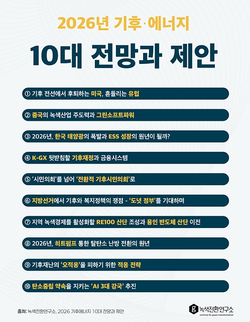 29일 녹색전환연구소는 '2026 기후·에너지 10대 전망과 제언' 보고서를 통해 내년을 '기후대응의 결정적 분기점"으로 규정하면서 △미국 기후정책 후퇴와 유럽의 동요 △중국 녹색산업 주도권 강화 △한국 재생에너지 급속 확대 필요성 △산업 전환을 뒷받침할 한국형 전환금융(K-GX)과 금융시스템 구축 △기후시민의회 구축 △지방선거에서의 기후·복지정책 쟁점 등 10대 핵심의제를 제시했다.