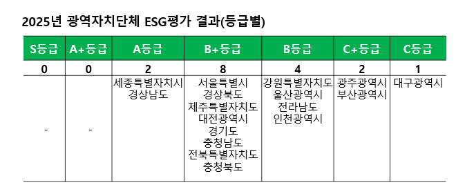 우리나라 17개 광역지방자치단체 가운데 세종특별자치시와 경상남도가 2025년 ESG 평가에서 'A등급'을 받았다. 반면 시장이 수개월째 공석인 대구광역시는 광역전체 가운데 유일하게 'C등급'을 받아 꼴찌가 됐다.