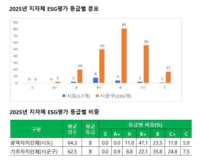17개 광역자치단체의 ESG 평균점수는 100점 만점에 64.3점으로 평균 B등급을 기록했다. 226개 기초자치단체는 62.5점으로 역시 평균 B등급을 기록했다. 이는 대부분의 자자체가 B등급에 몰려있다는 의미다.
