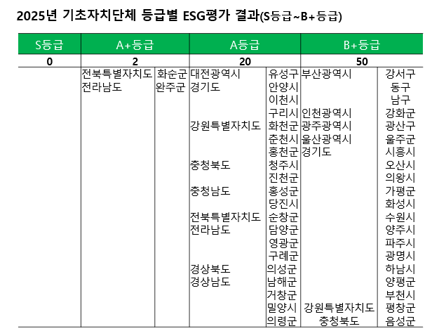 기초자치체에서는 아직 ESG행정에 크게 주안점을 두지 않는 곳이 많았다. 환경(E)부문에서 최하등급인 C등급을 받은 지자체는 45개('24년 40개), 사회(S)부문에서는 70개('24년 66개), 거버넌스(G)에서는 56개('24년 63개)에 달했다.