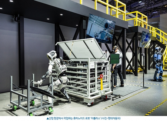현대자동차그룹은 1836평방미터(㎡) 규모의 공간에 차세대 전동식 휴머노이드 로봇 '아틀라스' 연구형·개발형 모델과 사족보행 로봇 '스팟' 등 피지컬 인공지능(AI) 신기술을 선보였다. 전시장은 실제 제조 시설처럼 꾸며져 있어, 아틀라스와 스팟이 산업 현장에서 어떻게 사람의 일손을 돕고, 효율을 높이는 지 직접 보여주는 방식으로 꾸며졌다.