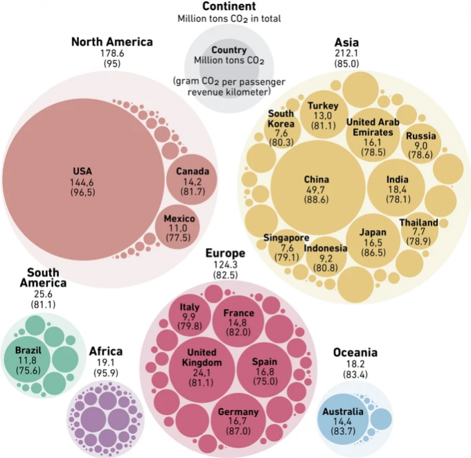 국가별로 살펴보면 96.5g CO₂/pkm를 배출하는 미국이 1위를 차지했다. 미국의 항공 배출량은 전세계 25%를 차지했다. 미국은 전세계 평균(84.4g CO₂/pkm)보다 운항 효율이 14% 더 낮은 수준이다. 중국은 88.6g CO₂/pkm로 2위, 독일이 81.1g CO₂/pkm로 3위를 기록했다.