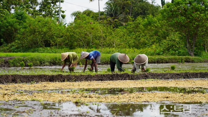 인도네시아와 같은 아열대 지역은 한해 두세 차례 벼농사가 가능하다. 한쪽 논에서 수확을 하면 다른 쪽 논에는 모내기를 하는 식이다. 수확을 마친 논 옆에서 농부들이 다시 모내기를 하기 위해 분주하게 움직이고 있었다.