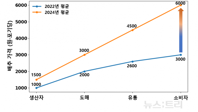 2022년에는 생산자·도매·유통·소비자 단계별 가격 차이가 비교적 완만하게 이어졌다. 하지만 2024년에는 생산자 가격 상승폭은 제한적인 데 비해 도매와 유통과정에서 가격 상승폭이 확대됐고, 최종 소비자가에서 격차는 더 크게 벌어졌다. 기후영향으로 생산단계에서 가격변동이 시작됐지만, 가격 상승폭이 누적된 지점은 유통과정이었다는 사실이 확인된 것이다.