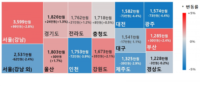 그러나 지역별 비용 격차는 더 벌어졌다. 대전과 광주는 10월보다 각각 4.4% 가격이 내려간 반면 서울 강남은 10월 3500만원에서 12월 3599만 원으로 2.8% 올랐다. 지난 4월 조사 이후 최고치다. 가장 낮은 경상(1228만 원)과 비교하면 3배 차이다.