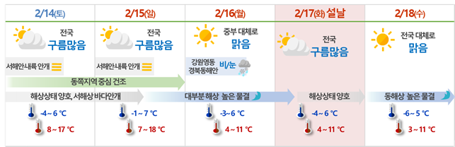 해상에서는 14∼15일 서해에 안개가 짙게 끼는 곳이 있겠다. 15일 오후부터 16일 사이에는 대부분의 해상에, 18일에는 동해상에 높은 물결이 예상돼 풍랑특보가 발효될 수 있다. 기상청은 도서지역을 오가는 여객선의 운항 여부를 확인할 것을 강조했다.