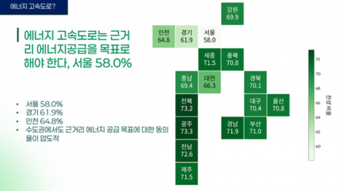 17개 광역지자체 거주하는 응답자의 65.7%는 재생에너지 생산지와 수요지를 잇는 '에너지 고속도로' 추진 목표로 지산지소, 즉 개별지역 에너지를 근거리에 공급하는 방식이 우선되어야 한다고 답했다. 이에 비해 '지방 생산 에너지를 수도권에 공급해야 한다'는 응답은 12.3%에 그쳤다. 이같은 지산지소 찬성 여론은 △서울(58.0%) △경기(61.9%) △인천(64.8%) 등 수도권 지역 응답자에게도 마찬가지로 나타났다.