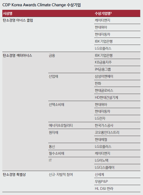 전세계 2만2000개가 넘는 기업의 환경성과를 평가하는 국제비영리기구 CDP의 한국위원회는 지난해 국내 기업 292개를 대상으로 '기후변화' 부문과 '물관리' 부문을 평가한 결과를 담은 '2025 CDP 한국 보고서'를 공개하고 지난 10일 우수기업을 시상했다. 우수기업으로 선정된 기업들은 A등급을 받은 기업 가운데 제3자 입증까지 통과한 기업들이다.
