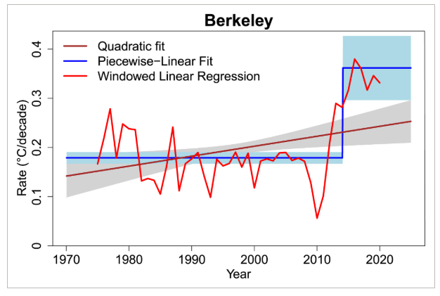 독일 포츠담 기후영향연구소와 포츠담대학교 연구진은 엘니뇨 현상과 화산활동, 태양변동 등 자연요인을 제거한 뒤 지구 평균기온 데이터를 분석한 결과, 현재 온난화 속도는 0.34℃~0.42℃ 수준에 달한다는 연구결과를 최근 발표했다.