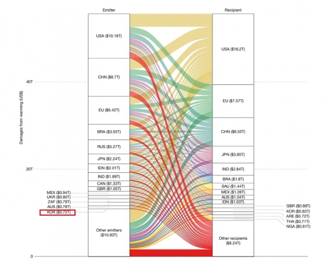 같은 시기, 한국은 온실가스 배출로 약 7200억달러(약 1000조원) 규모의 경제적 피해를 발생시킨 것으로 분석됐다. 이는 미국과 중국(약 1경3000조원), 유럽연합(약 9600조원) 등에 비해 피해규모가 현저하게 낮은 수준이지만 전세계 상위 15위권에 해당하는 피해규모다.