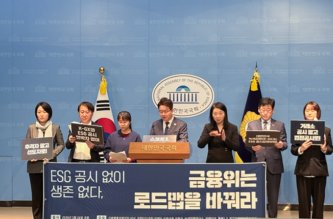 더불어민주당 기후행동의원모임 '비상'과 국회ESG포럼, 한국사회책임투자포럼, 녹색전환연구소, 플랜1.5, 기후변화청년모임 빅웨이브 등은 26일 국회에서 공동 기자회견을 열고 "현재 초안은 기업의 단기 부담만 고려한 설계로, 공시 시기와 대상, 방식 등 전반에서 국제 흐름에 뒤처져 있다"고 비판했다.