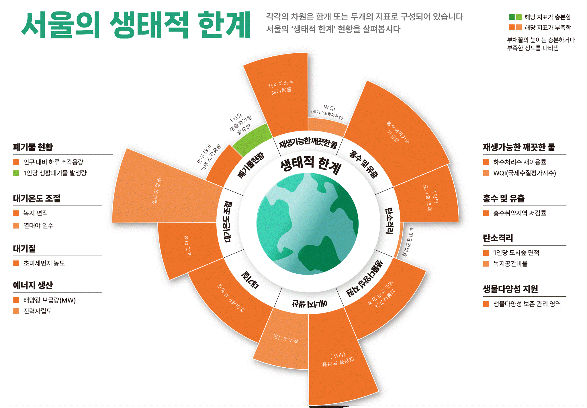 서울의 대기질과 생물다양성 자원, 재생가능한 깨끗한 물, 에너지 생산, 폐기물 현황 등 렌즈를 분석한 결과 총 41개 지표 가운데 33개가 기준치에 미달했다.