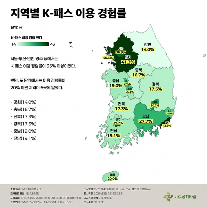 특히 정부가 최근 지원을 대폭 늘리기로 한 K-패스는 대중교통 수요가 높은 대도시에서만 이용률이 높게 나왔다. 'K패스 이용경험'을 묻는 질문에 서울과, 부산, 인천 등에선 '이용경험이 있다'는 응답이 35% 이상이었지만, 그외 지역에선 K-패스 이용률이 20%를 밑돌았다. 강원도의 경우 이용률이 14%로 가장 적었고, 충청북도도 16.7%에 그쳤다.