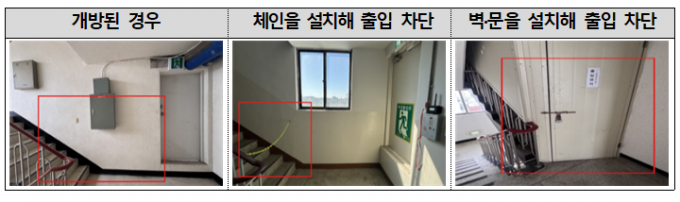 또 아파트의 40%(12개소)는 옥상광장이 최상층 아닌 최상층의 아래층에 위치해있었다. 이 가운데 62.5%(5개소)는 최상층으로 향하는 피난계단이 차단장치 없이 개방돼있어, 화재 시 거주자가 옥상광장이 최상층에 있다고 착각하고 잘못 대피할 우려가 있었다.